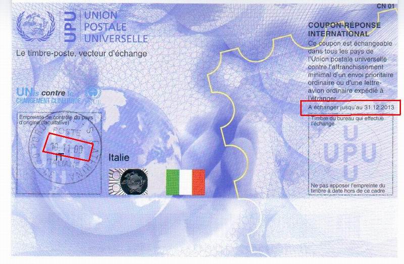 Ciao Remigio, so che i nuovi IRC sono entrati in vigore dal 01/01/2010 ed hanno scadenza 31/12/2013. Il costo è di 1.29 euro cad. Negli uffici postali sono pressochè sconosciuti. Puoi provare in qualche ufficio importante tipo Verona 2 (via Cattaneo). Portati la stampa dell'immagine qui sotto e chiedi dell'impiegato che si occupa della filatelia. Oppure il metodo più usato è inviare una email a international_letter_mail@posteitaliane.it indicando quanti IRC vuoi e in quale ufficio postale vuoi ritirali. Se sei fortunato (!!) ti rispondono e ti confermano l'invio all'ufficio. Ricordati che quando vai a ritirarli devono timbrarteli nel riquadro in basso a sinistra, altrimenti chi li riceve non può cambiarli. Ecco come sono: