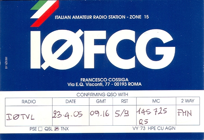 Apprendo ora dal telegiornale che l'ex presidente Francesco Cossiga I0FCG è passato in Silent Key poche manciate di minuti fa.