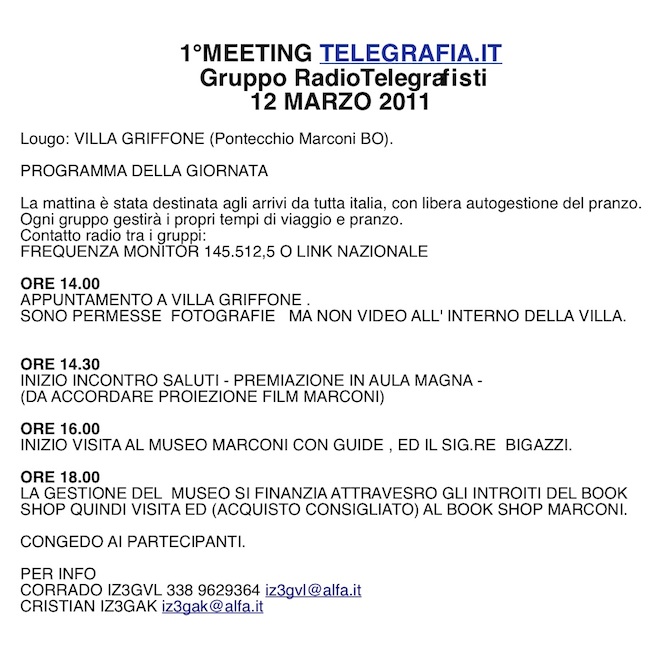 PRE-ADESIONE AL MEETING TELEGRAFIA.IT E' in programma il primo meeting del Gruppo Radiotelegrafisti di telegrafia.it a Bologna e precisamente a Villa Griffone. Indicativamente sara' previsto per fine marzo 2011 ma dobbiamo avere ancora conferma da Villa Griffone. Nel frattempo abbiamo bisogno di sapere quante persone potranno, in linea di massima, essere presenti per poterci organizzare a dovere. Durante il meeting verranno svolte anche le premiazioni del "Diploma S" e naturalmente la visita della Villa. Possono partecipare anche i NON membri, bisogna compilare il modulo qui sotto che apparira' solamente una volta autenticati con la solita procedura, indicando il numero di persone con cui si intende partecipare, per esempio se venite con la moglie, sul campo "Partecipanti", inserirete il n.2; se venite con un amico OM non del gruppo GRT inserite in n.2; ecc... Questa iscrizione non e' vincolante, tuttavia se pensate di non venire e' meglio non iscriversi, lo potete fare sempre all'ultimo, pero' avere gia' un'idea di quanti siamo e' molto importante. Inviatemi email di conferma poi ci penso io a inserire sul sito GRT ik3jbp-qrp@libero.it 73 IK3JBP Ampelio