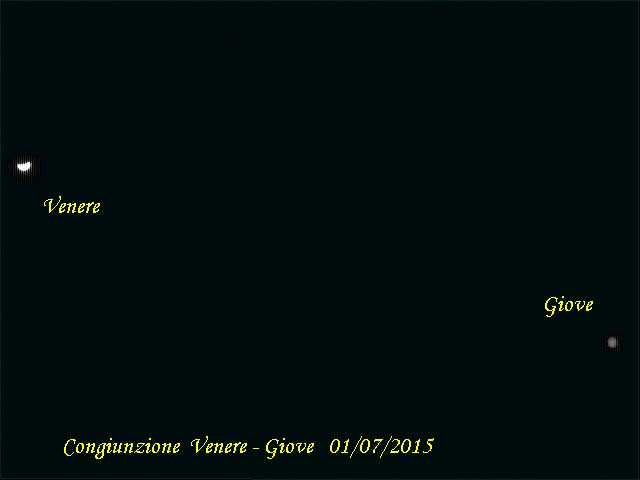 Ciao a tutti. In queste sere, si sta verificando nei nostri cieli, uno spettacolo straordinario. La congiunzione di Venere con Giove. Giove e Venere sono vicinissimi nel cielo e ben visibili anche a occhio nudo già dopo il tramonto. Da giorni spiccano nel cielo, sempre più vicini, e il primo luglio hanno raggiunto la distanza minima nella costellazione del Leone. La loro distanza e inferiore al diametro della Luna. Le congiunzioni non sono rare, ma questa è particolare, perchè i pianeti sono vicinissimi. A completare lo spettacolo c'è Saturno, ben visibile a Sud, mentre a Est sorge la luna quasi piena, che non disturba affatto lo spettacolo di Giove e Venere, che si trovano dalla parte opposta